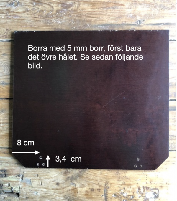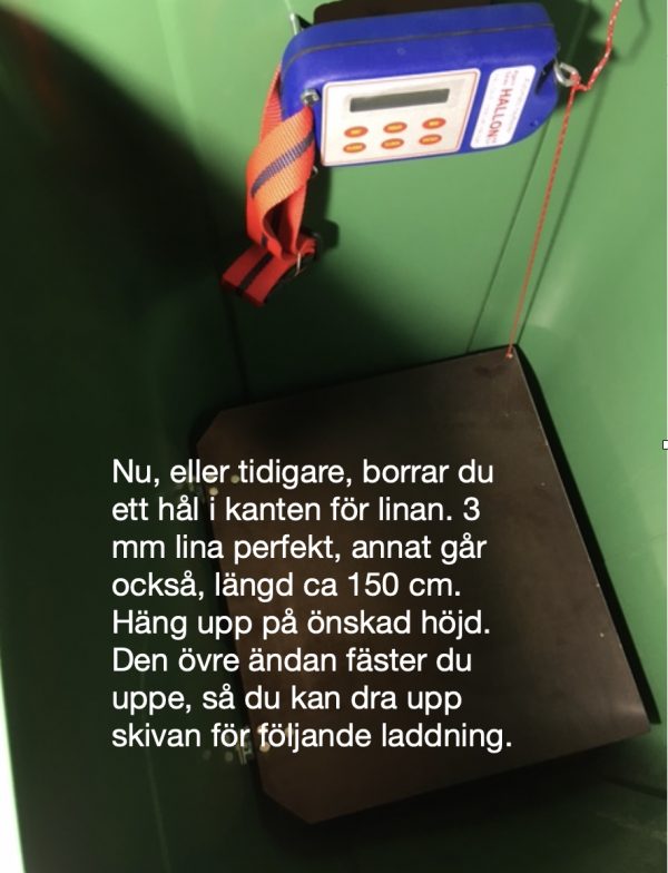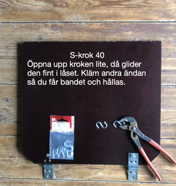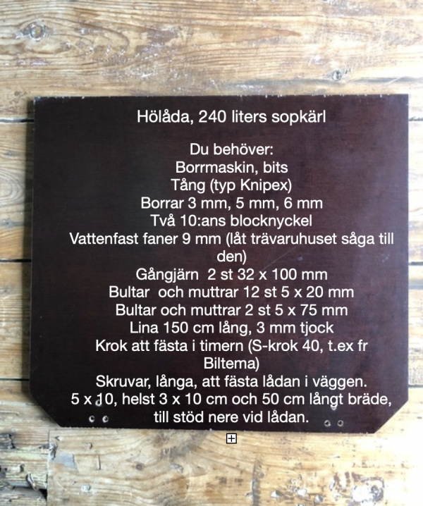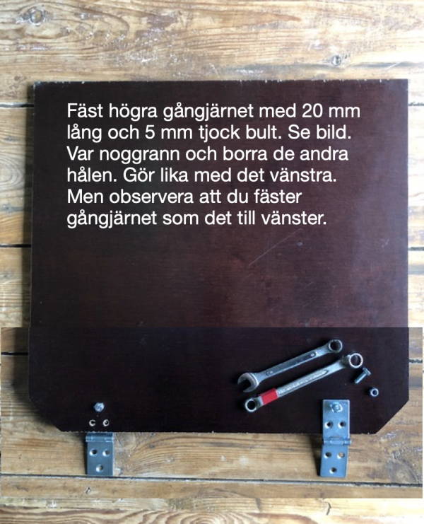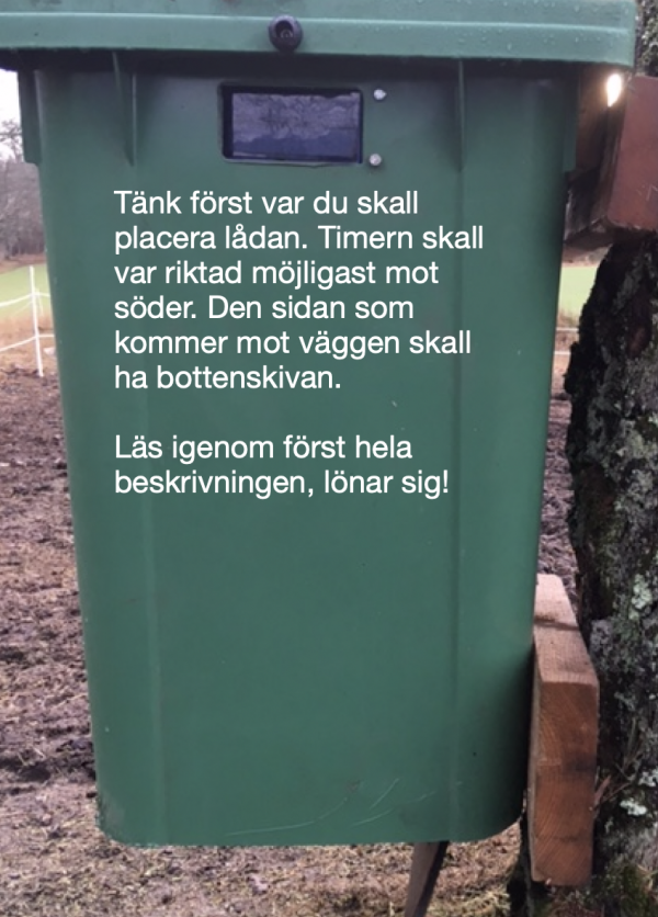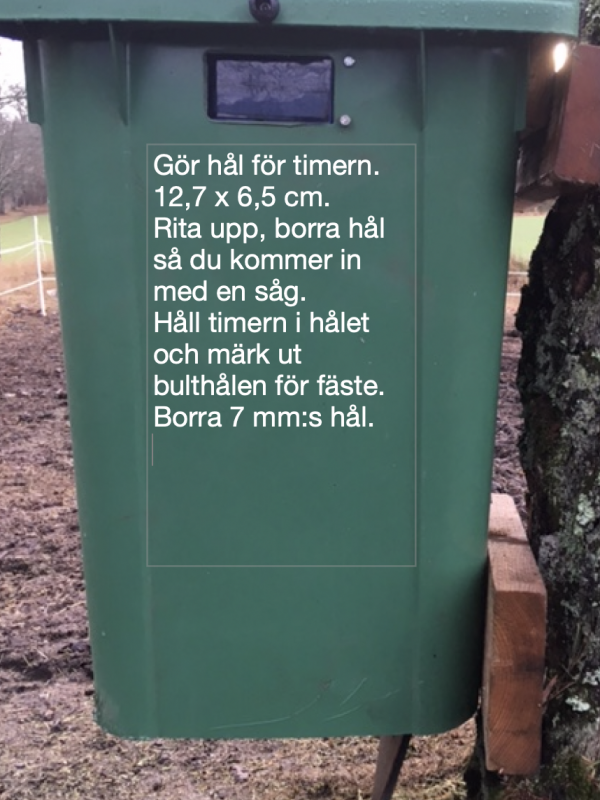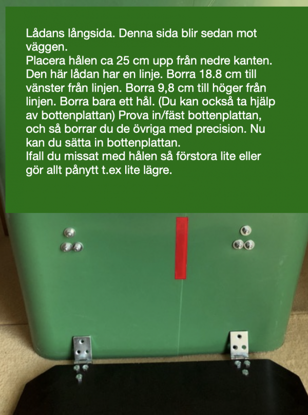 Kolla igenom bilderna. Om du inte har likadana gångjärn, bör du passa med hålen själv. Lådan kan fästas i väggen med skruvar, en bricka kan vara bra att ha. Det lönar sig att genast sätta elband kring lådan, förr eller senare kommer hästarna att försöka komma åt höet. Se bilder till sist, på elbandslösning.